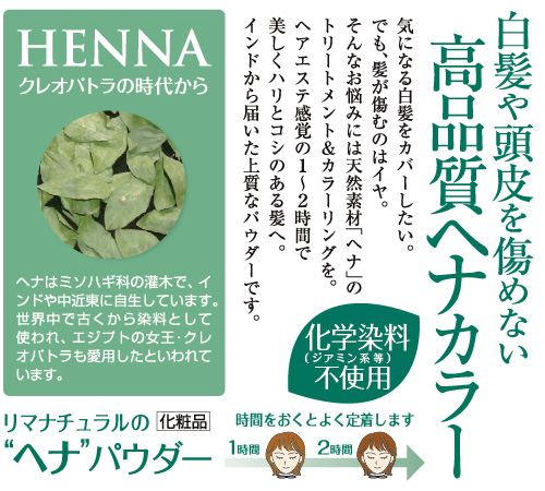 ヘナとは、ナチュラルで髪にも環境にも優しい植物性トリートメントカラー。リマナチュラルでは品質に特にこだわり、インドでも有数の品質管理の行き届いた工場と提携して上質を追求しました。